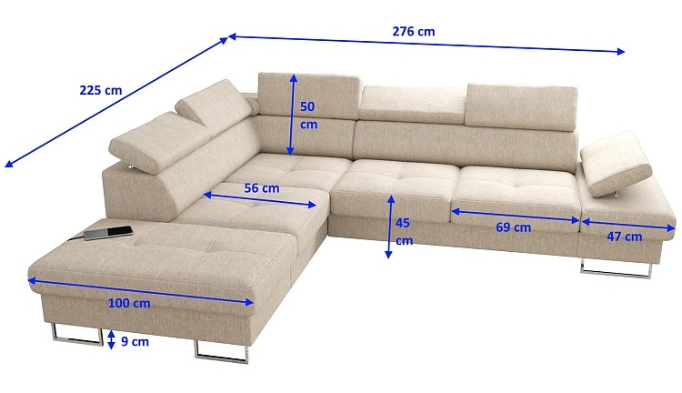 Das Ecksofa Galaxy aus der gleichnamigen Polstermöbelserie ist mit den Abmessungen 276x225 cm das ideale Möbelstück für ein mittelgroßes Wohnzimmer. Den Sitzkomfort garantiert die hochwertige Wellenunterfederung in Verbindung mit dem hochelastischen Polsterschaum sowie die fünf verstellbaren Kopfstützen und eine verstellbare Armlehne. Das Ecksofa ist von allen Seiten mit dem Originalstoff bezogen, so dass sie auch mitten im Raum aufgestellt werden kann. Der abgebildete Hocker gehört nicht zum Lieferumfang, kann aber gegen Aufpreis dazu bestellt werden.