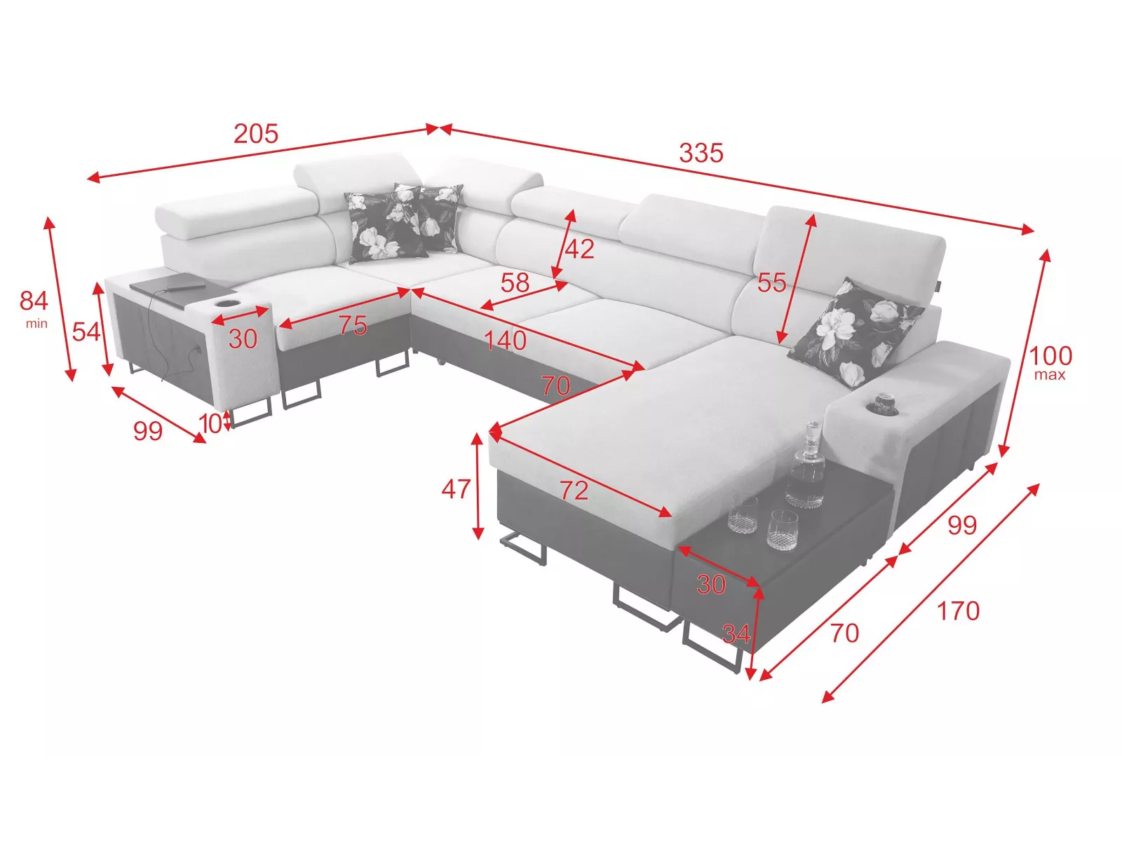 - Eine ausziehbare Schlaffunktion mit der Liegefläche von 258x127 cm. Die Farbe der ausziehbaren Liegefläche kann von der Hauptfarbe des Ecksofas abweichen.
