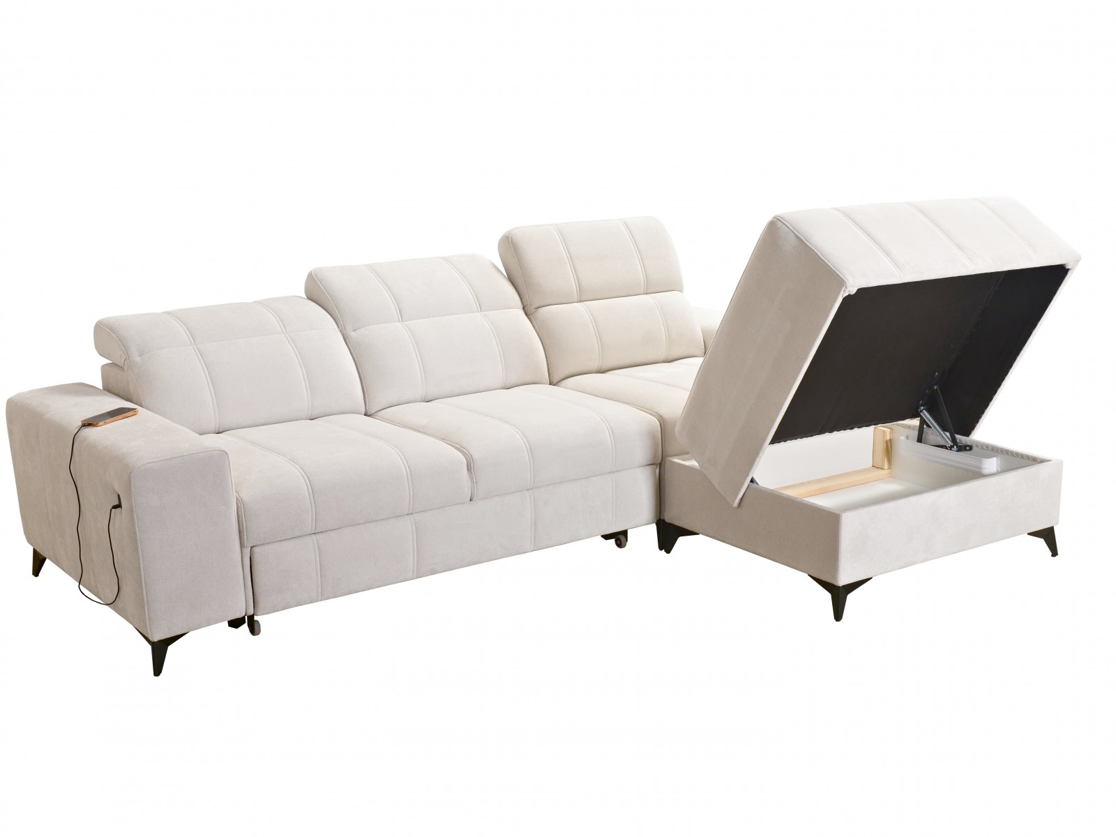 - Eine ausziehbare Schlaffunktion mit der Liegefläche von ca. 209 x 129 cm. Die Farbe der ausziehbaren Liegefläche kann von der Hauptfarbe des Ecksofas abweichen.