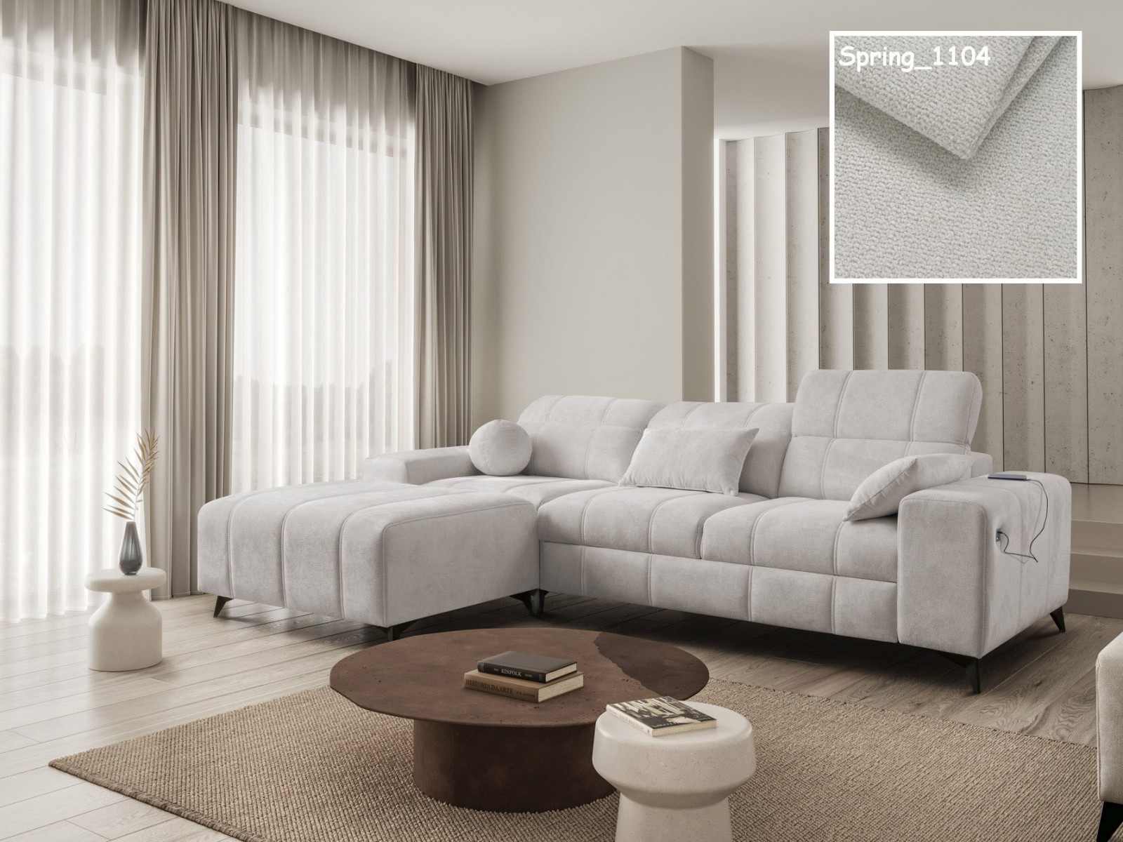 Dafne 1 Ecksofa oder Dreisitzer mit Hocker, frei kombinierbar mit USB, Bettfunktion, Bettkasten und drei verstellbaren Kopfstützen.
