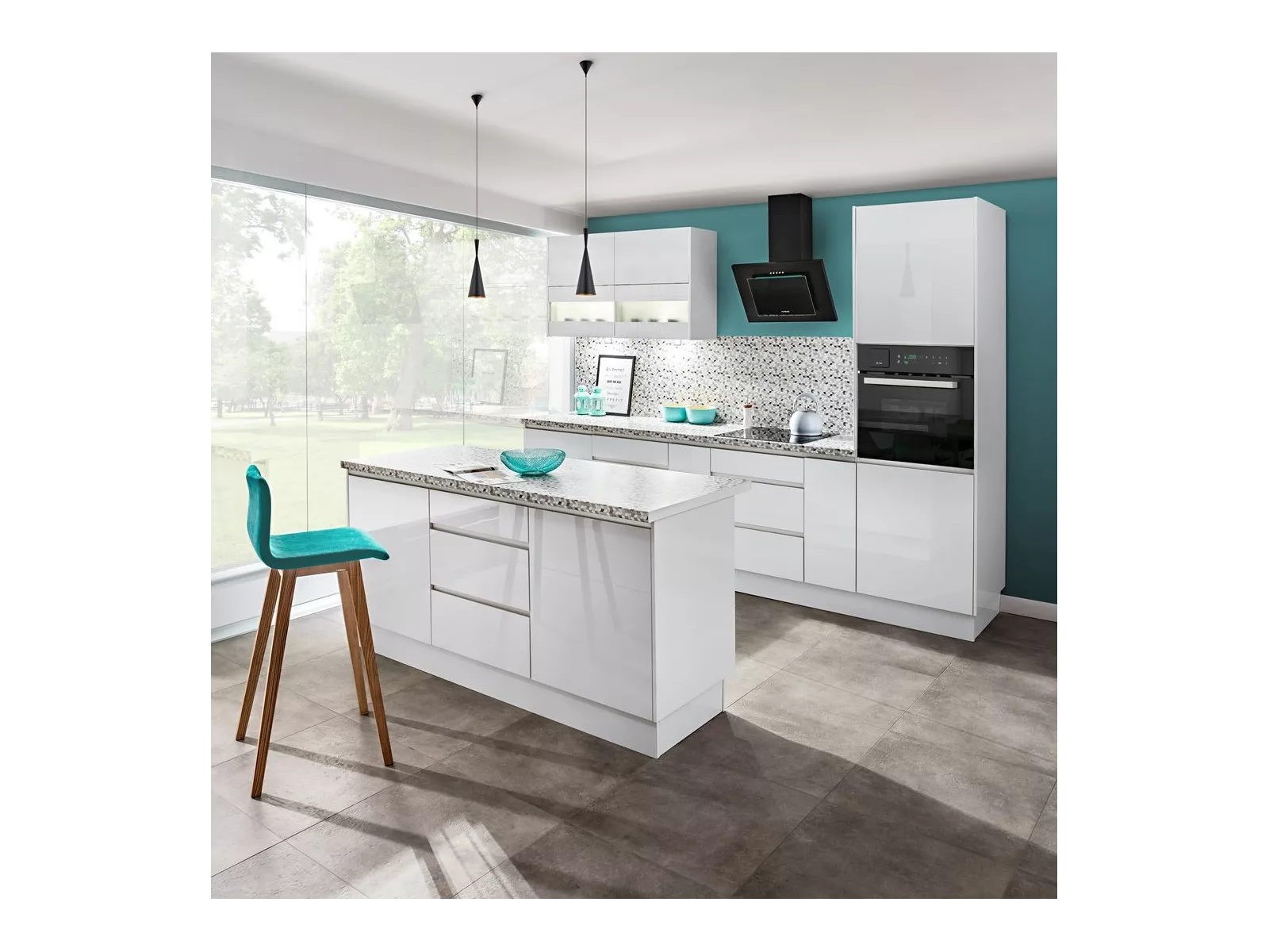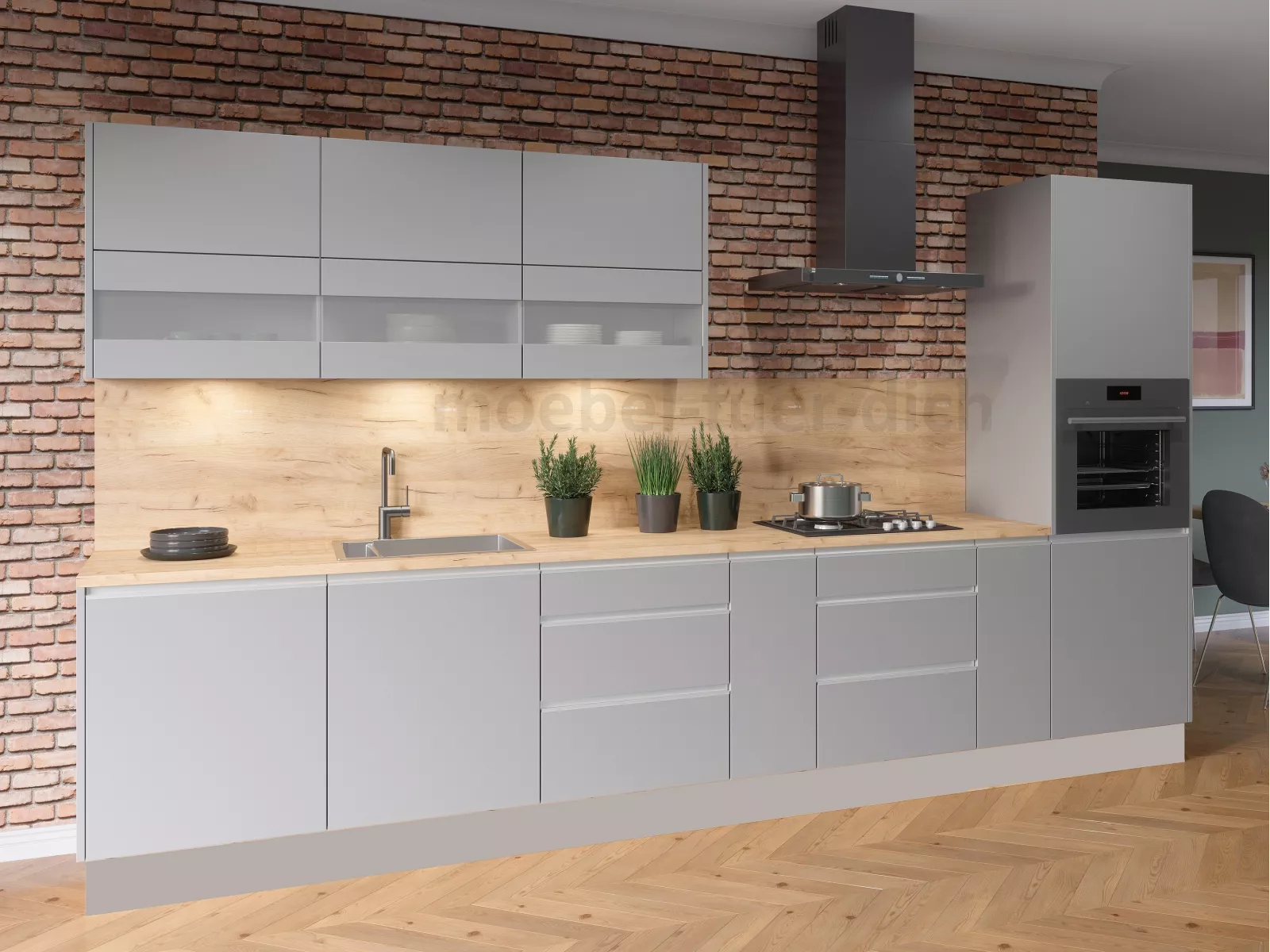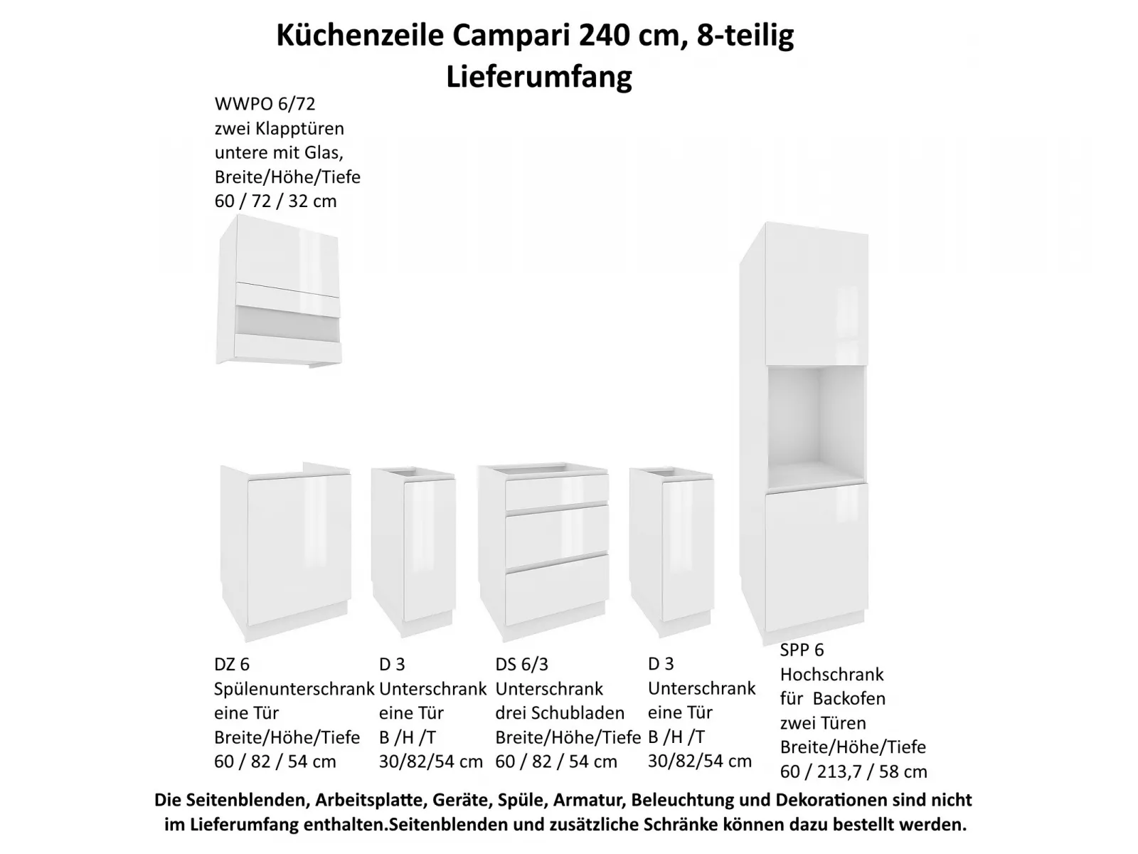 - Bitte beachten Sie, dass Seitenblenden, Arbeitsplatte, Geräte, Spüle, Armatur, Beleuchtung und Dekorationen nicht zum Lieferumfang gehören.