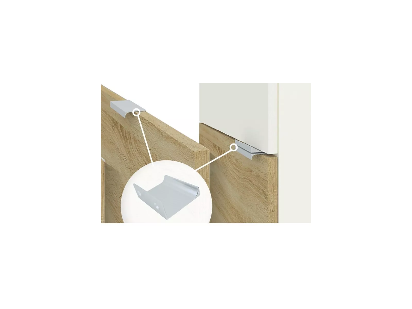 - Anders als bei anderen Schränken aus der Kollektion wird hier aus technischen Gründen ein minimalistischer Metallgriff eingesetzt