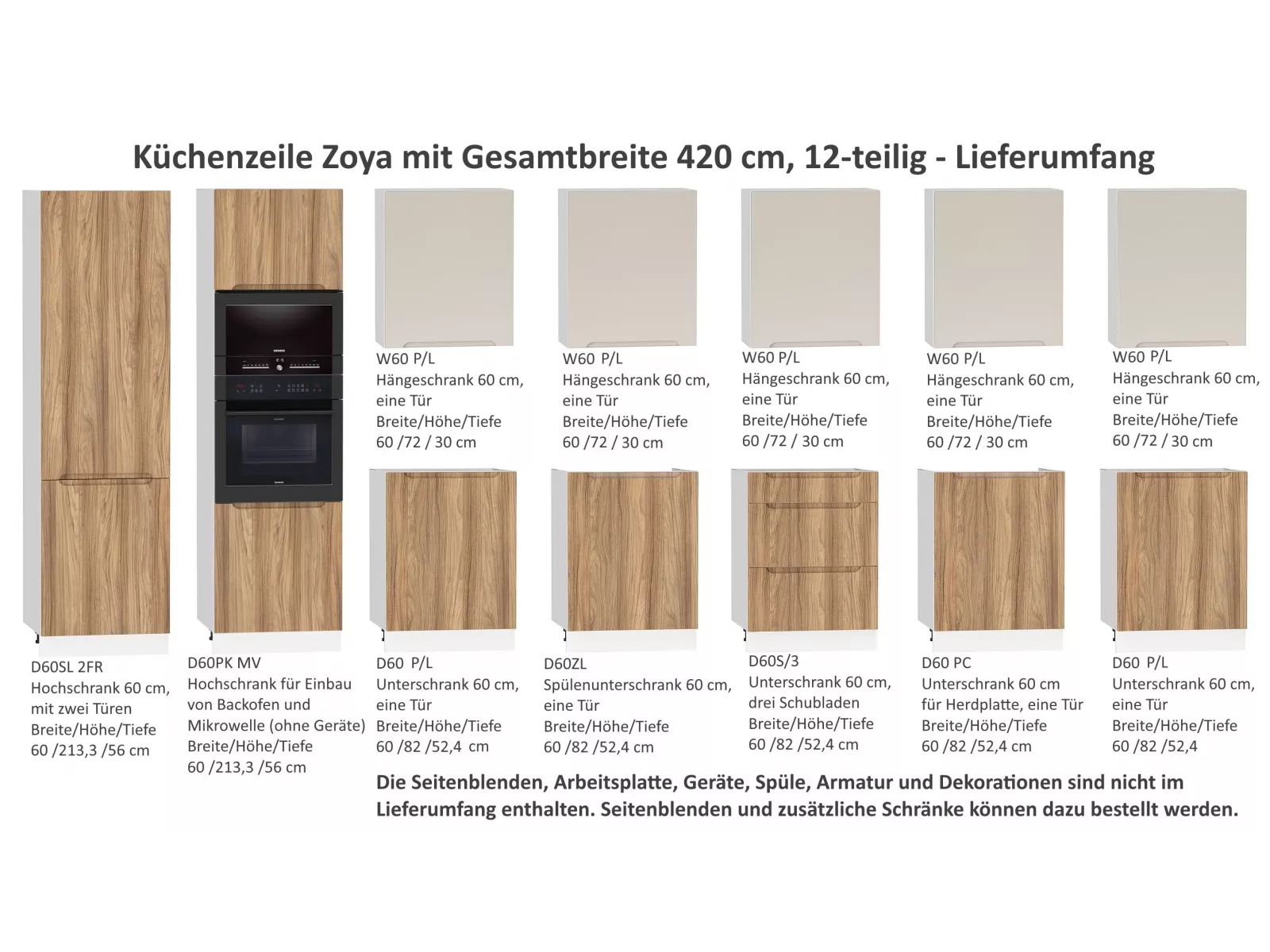 - Bitte beachten Sie, dass Seitenblenden, Arbeitsplatte, Geräte, Spüle, Armatur und Dekorationen nicht zum Lieferumfang gehören.