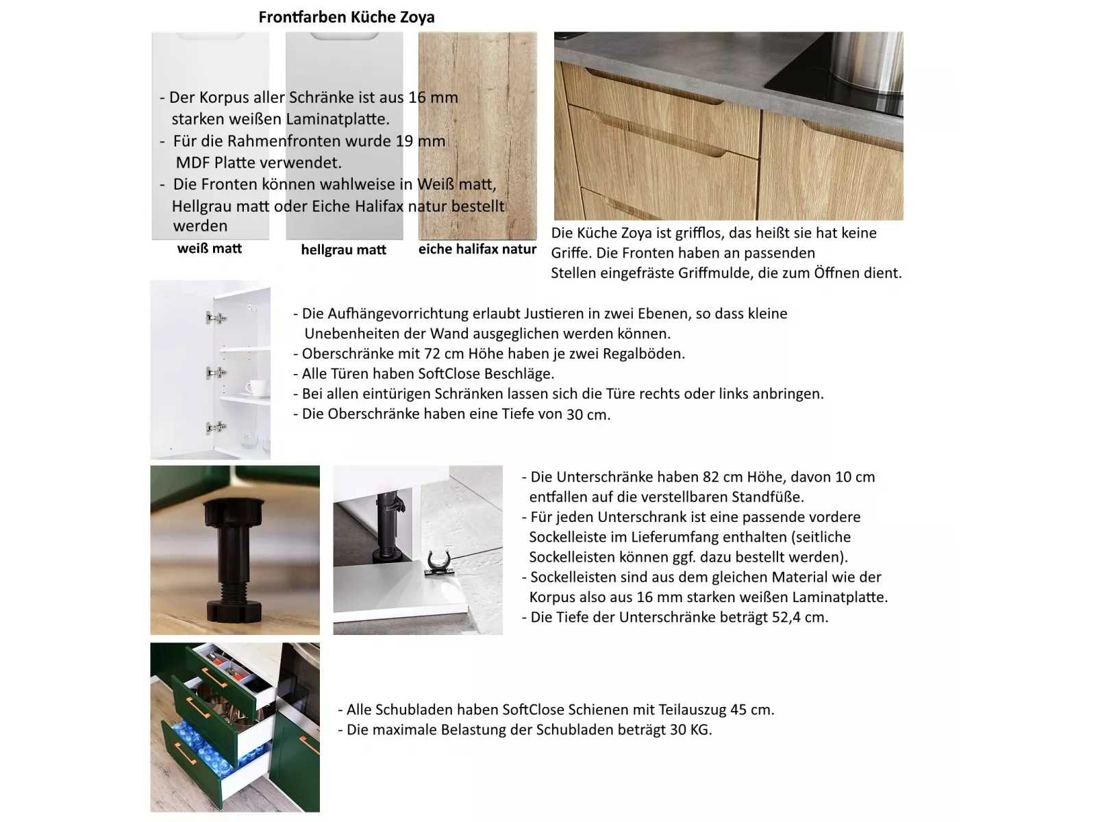 - Alle Schubladen haben SoftClose Schienen mit Teilauszug 45 cm. Die maximale Belastung der Schubladen beträgt 30 KG.