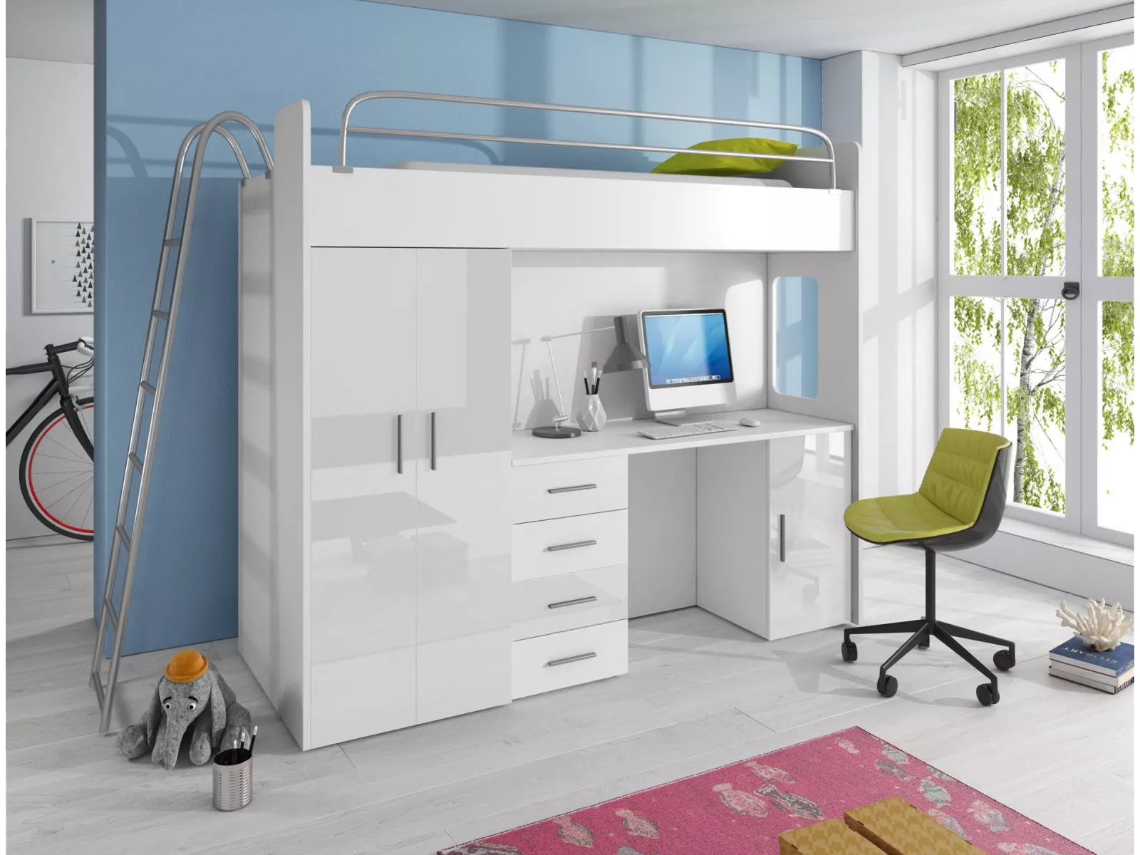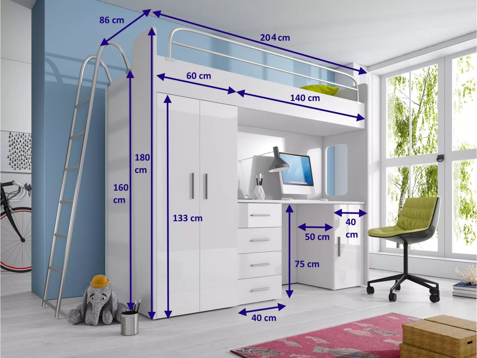 NICKI ist ein Multifunktionales Möbelstück für das moderne Jugendzimmer. Es besteht aus einem stabilen Hochbett / Etagenbett mit Liegefläche 80x200 cm, einem Schreibtisch und einem Kleiderschrank.