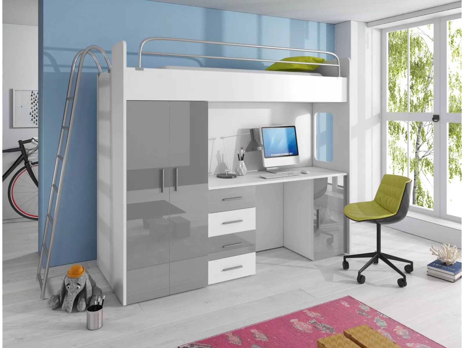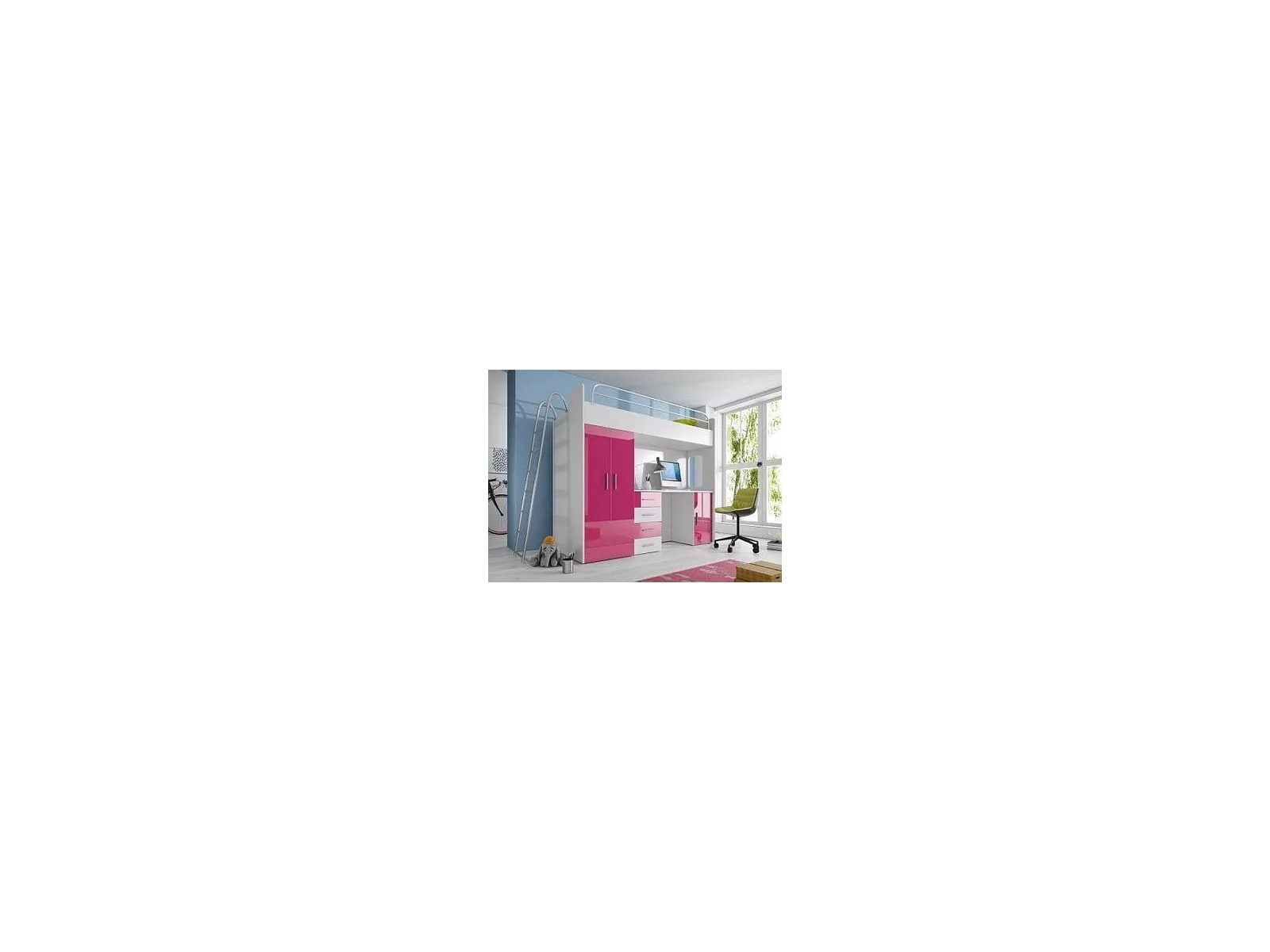 NICKI - Hochbett mit Kleiderschrank und Schreibtisch mit Hochglanz-Fronten in weiß / grau /schwarz / rosa