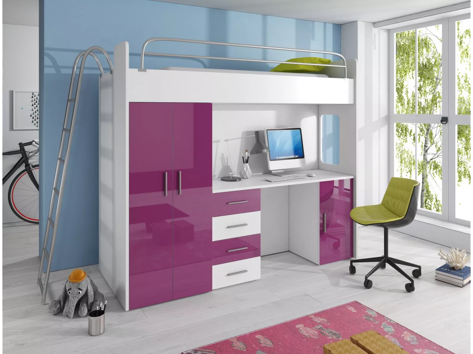 NICKI - Hochbett mit Kleiderschrank und Schreibtisch mit Hochglanz-Fronten in weiß / grau / schwarz / lila / blau / rosa