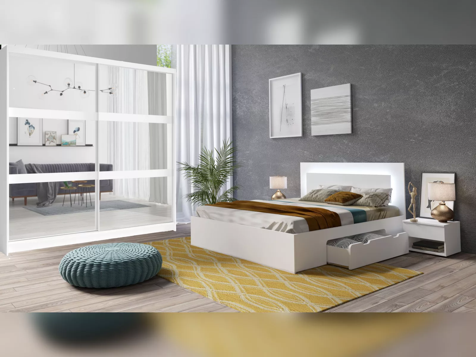 Komplettschlafzimmer Fino besteht in der Standardkonfiguration aus einem 230 cm breiten Schiebetürenschrank, einem Doppelbett mit Bettkastenschubladen und LED-Beleuchtung sowie zwei Nachttischen. Optional können ein Lattenrost und eine passende Kommode dazu bestellt werden.