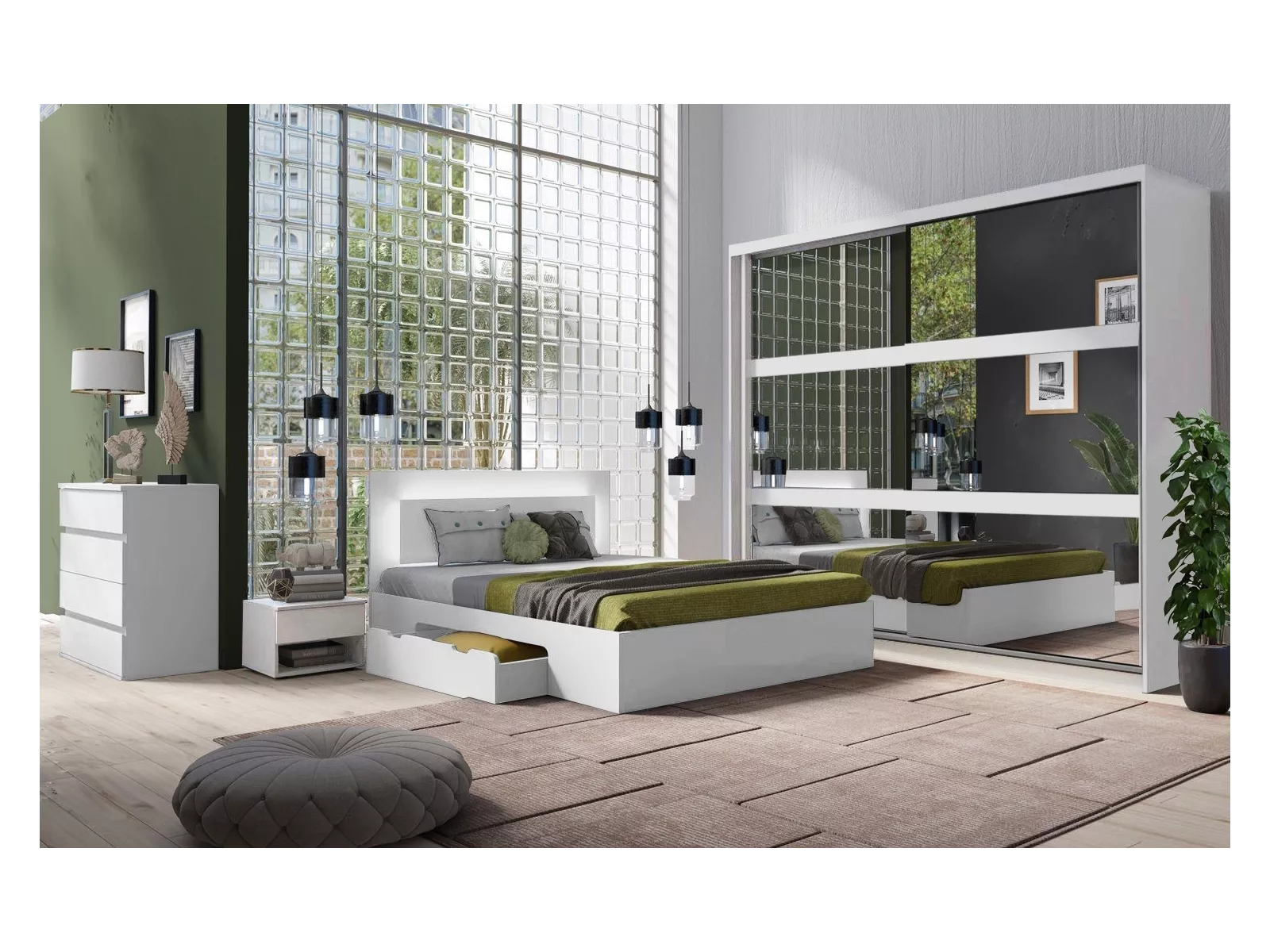 Das Schlafzimmer-Set wird hier in Weiß angeboten. Für die Herstellung wurde hochwertige robuste Laminatplatte mit ABS-Kanten verwendet. In die Schranktüren wurden insgesamt sechs Spiegel integriert. Die Türe lassen Sie ohne großen Kraftaufwand und leise auf leichtgängigen Schienen bewegen. Das Bett hat zwei geräumige Bettkastenschubladen. Im Kopfteil ist LED-Beleuchtung eingebaut. Die Nachttische verfügen über eine Schublade und ein offenes Fach.