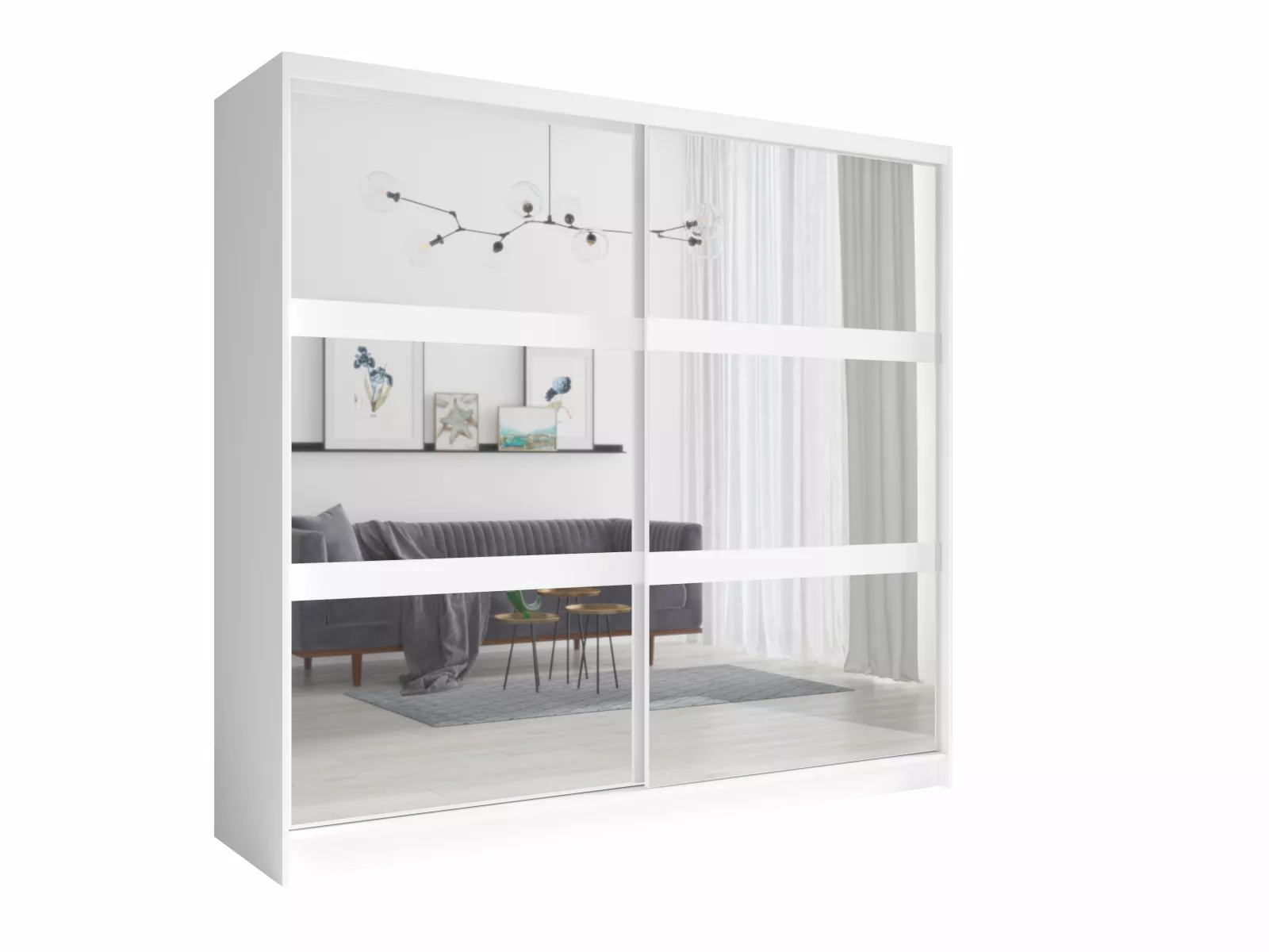 Der Schrank hat innen 10 Fächer und zwei Kleiderstangen. Die beiden Schiebetüren bewegen sich auf leichtgängigen Schienen. In die Türen sind insgesamt 6 Spiegel eingebaut.