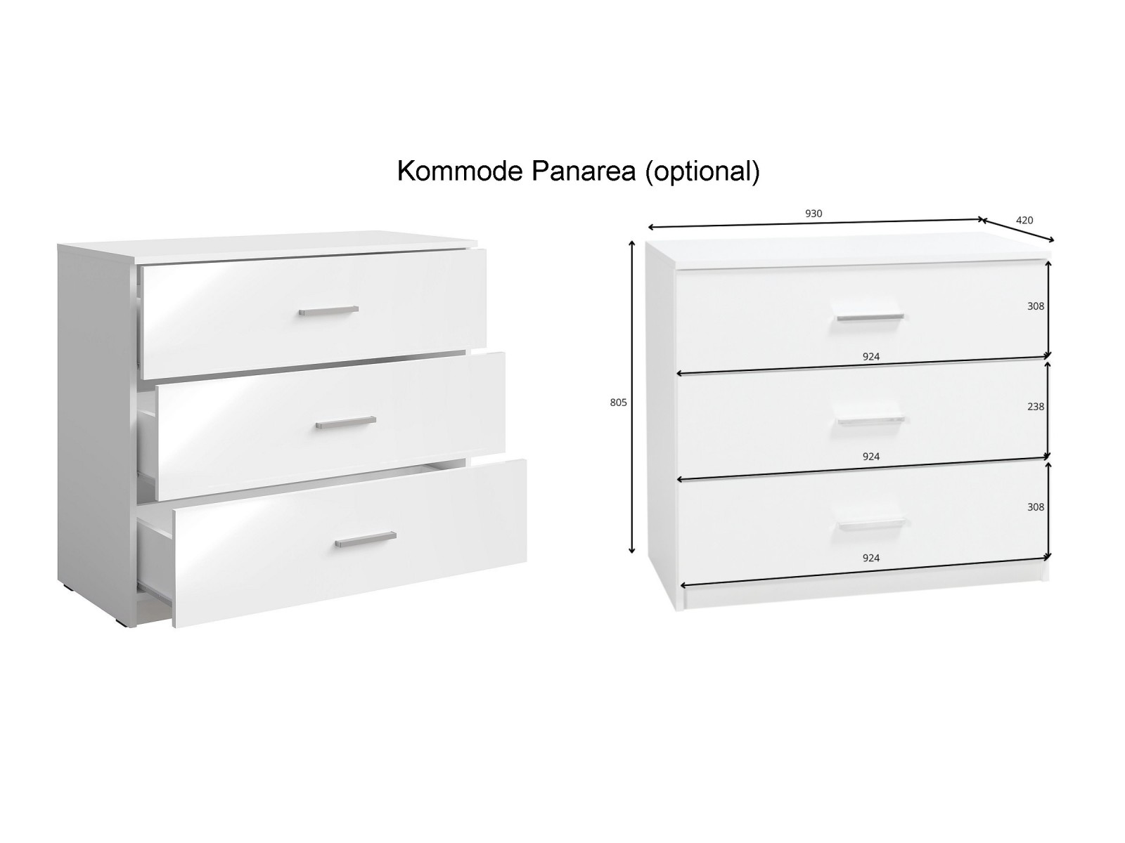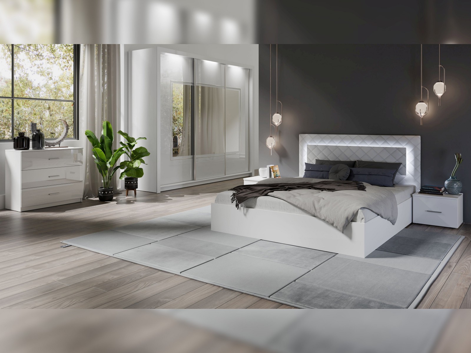 Das Panarea Schlafzimmer-Set überzeugt durch seine edlen Hochglanz-Fronten in Weiß, ein komfortables Doppelbett mit gepolstertem Kopfteil aus Kunstleder und integrierter LED-Beleuchtung. Es besteht aus einem Doppelbett mit Bettkasten, einem dreitürigen Schiebetürenschrank sowie zwei Nachttischen. Optional kann das Set um eine passende Kommode ergänzt werden.