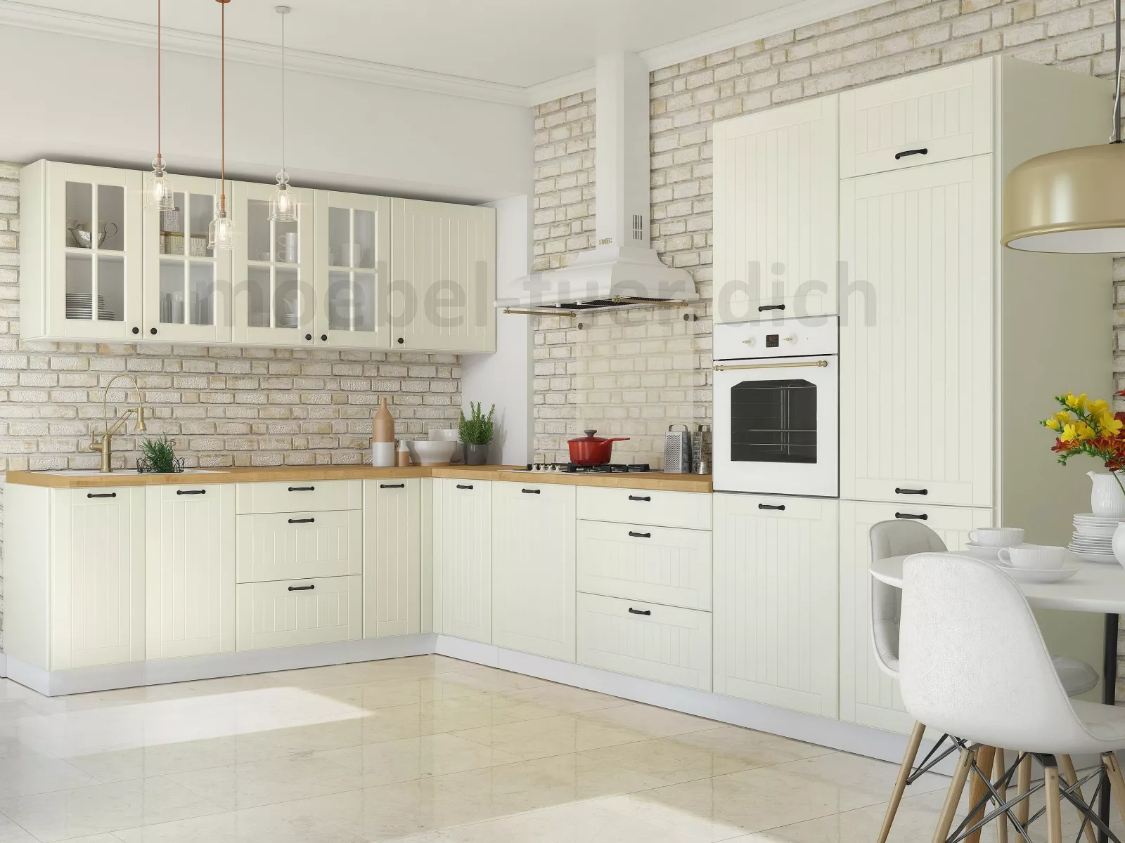 Die Küchen im Landhausstil sind zeitlos und werden nie aus der Mode kommen. Die landhaus Küchenzeile Lora bietet alles, was Sie brauchen, um eine Landhausküche einzurichten. Die mit Sprossen versehenen Glastüren der Vitrinen, die Fronten mit gefrästen senkrechten Rillen sowie die stilvollen schwarzen Metallgriffe sorgen für den besonderen Landhauscharakter der Küche.