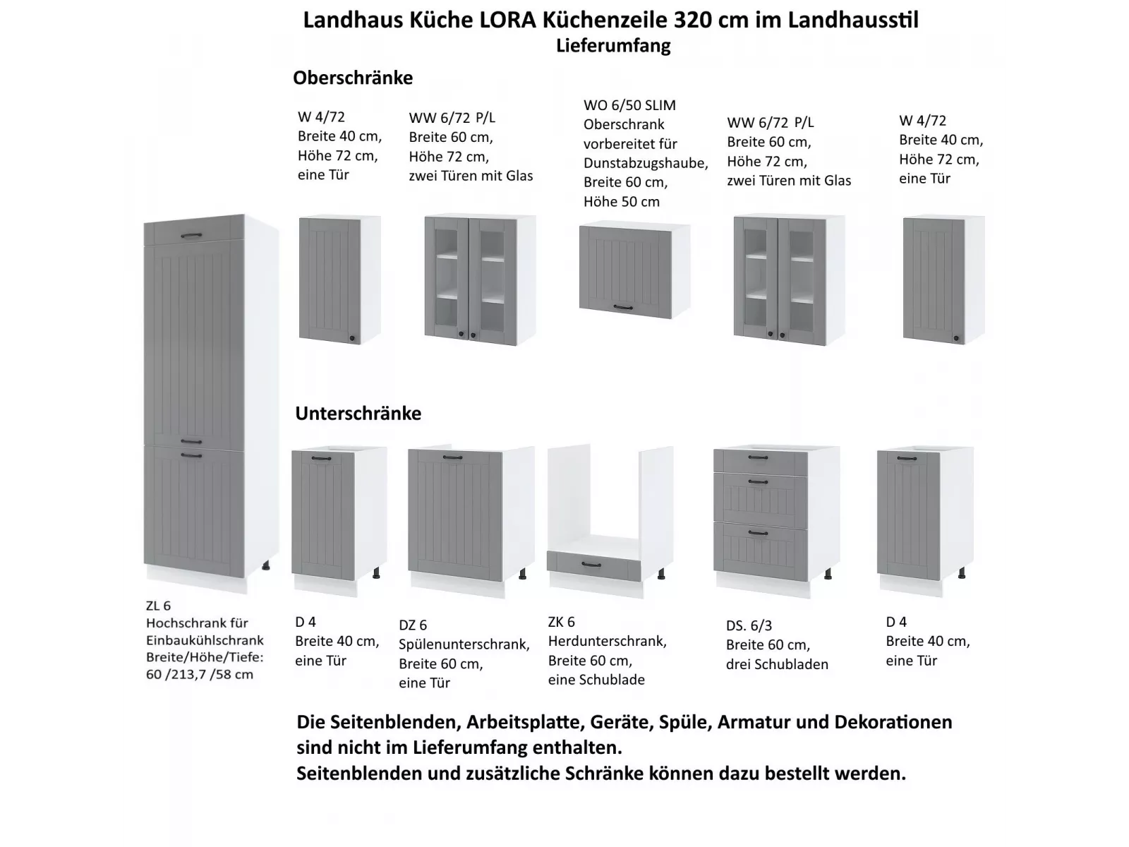 - Bitte beachten Sie, dass Seitenblenden, Arbeitsplatte, Geräte, Spüle, Armatur und Dekorationen nicht zum Lieferumfang gehören.