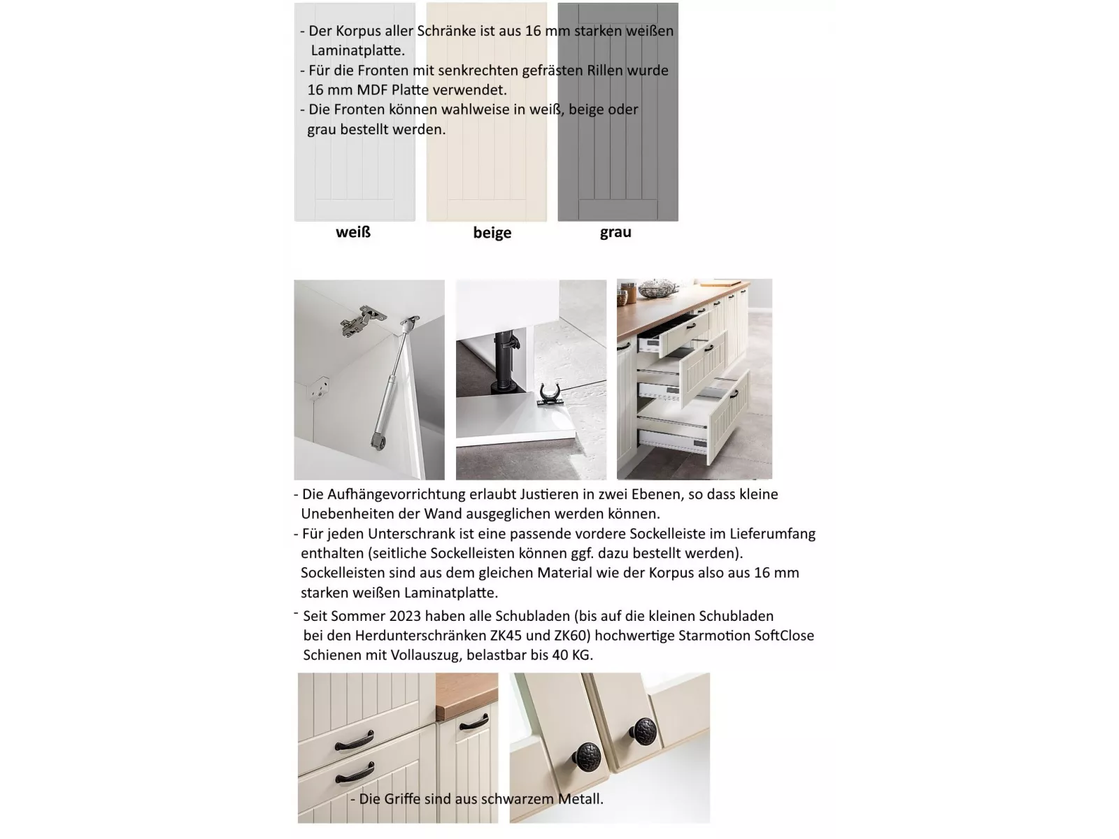 - Seit Sommer 2023 haben alle Schubladen hochwertige Starmotion SoftClose Schienen mit Vollauszug, belastbar bis 40 KG (bis auf die kleinen Schubladen bei den Herdunterschränken ZK45 und ZK60).