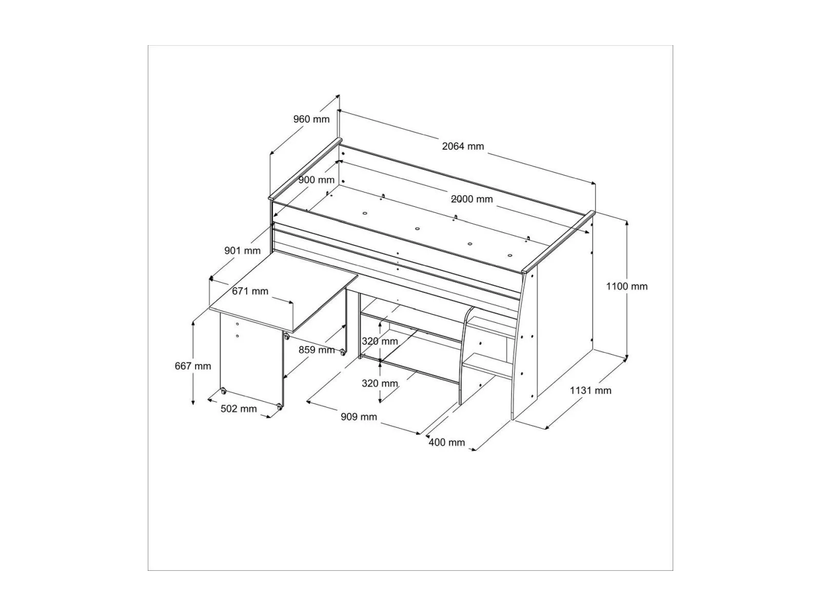 Parisot Reverse 1 Hochbett mit Schreibtisch, Fach und Ablagen
