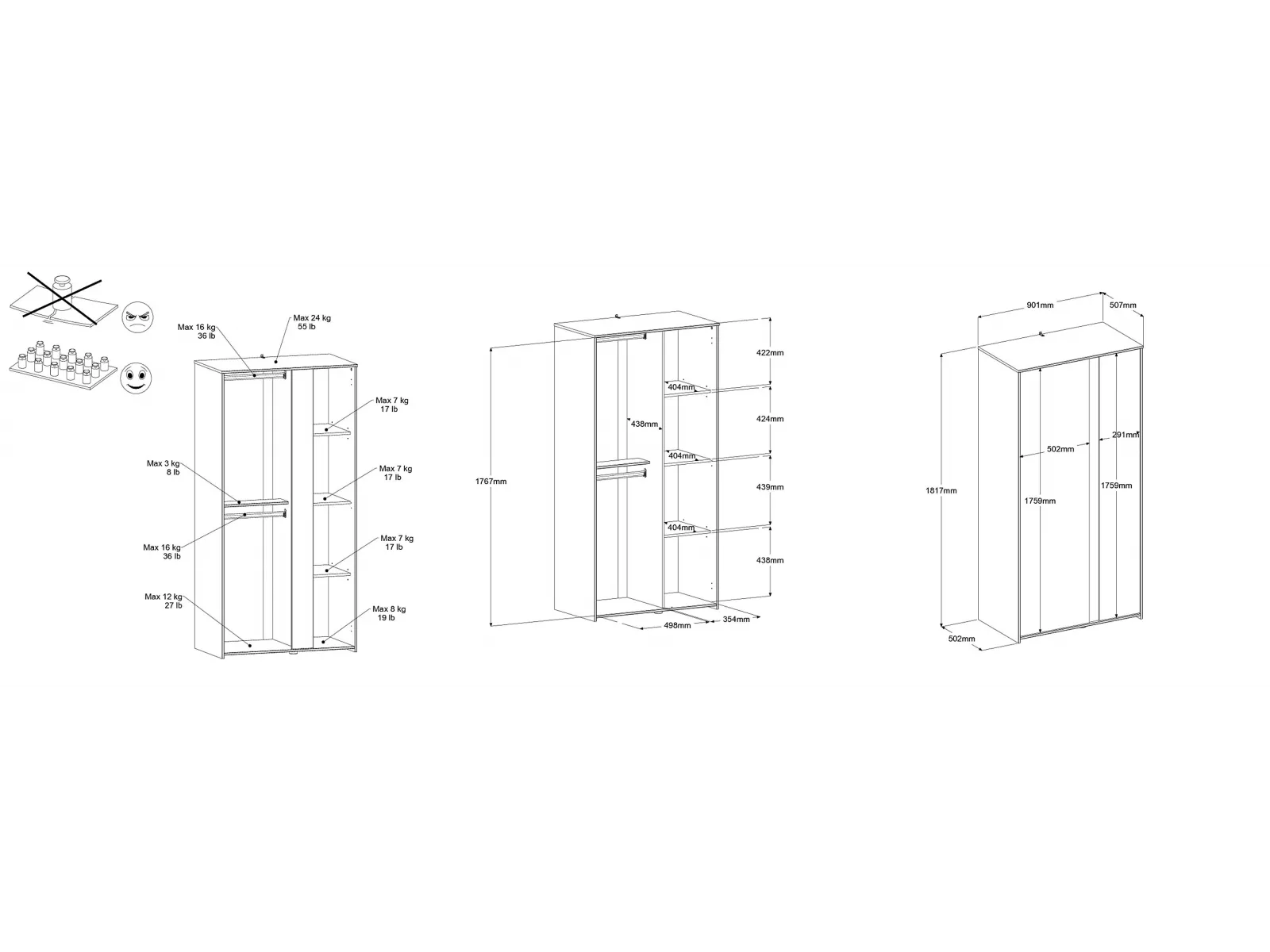 - Links 2 Kleiderstangen, in der Mitte eine Ablage.