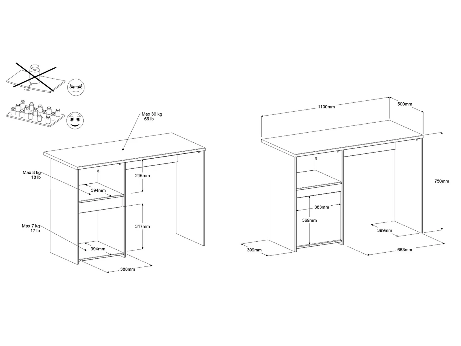 Einen funktionalen Schreibtisch mit offenem Fach und einer Schublade mit Tür, perfekt für Hausaufgaben, Zeichnen oder Basteln.
