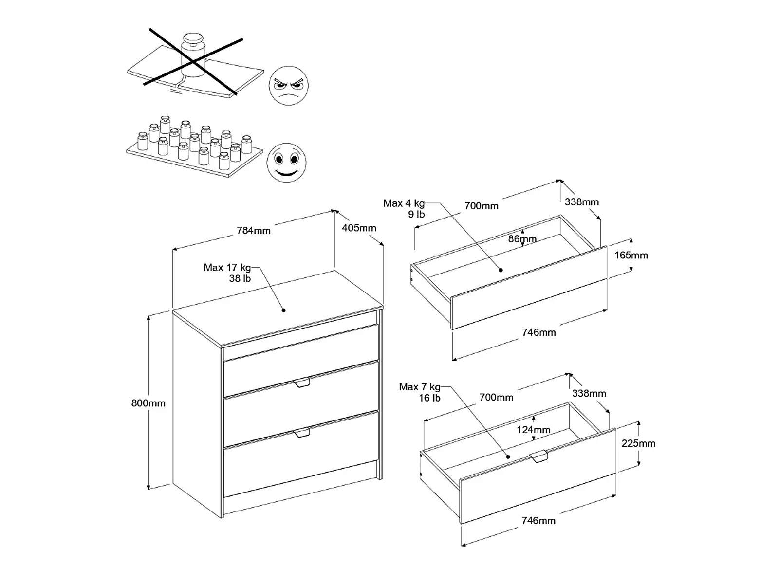 - Mit drei Schubladen.