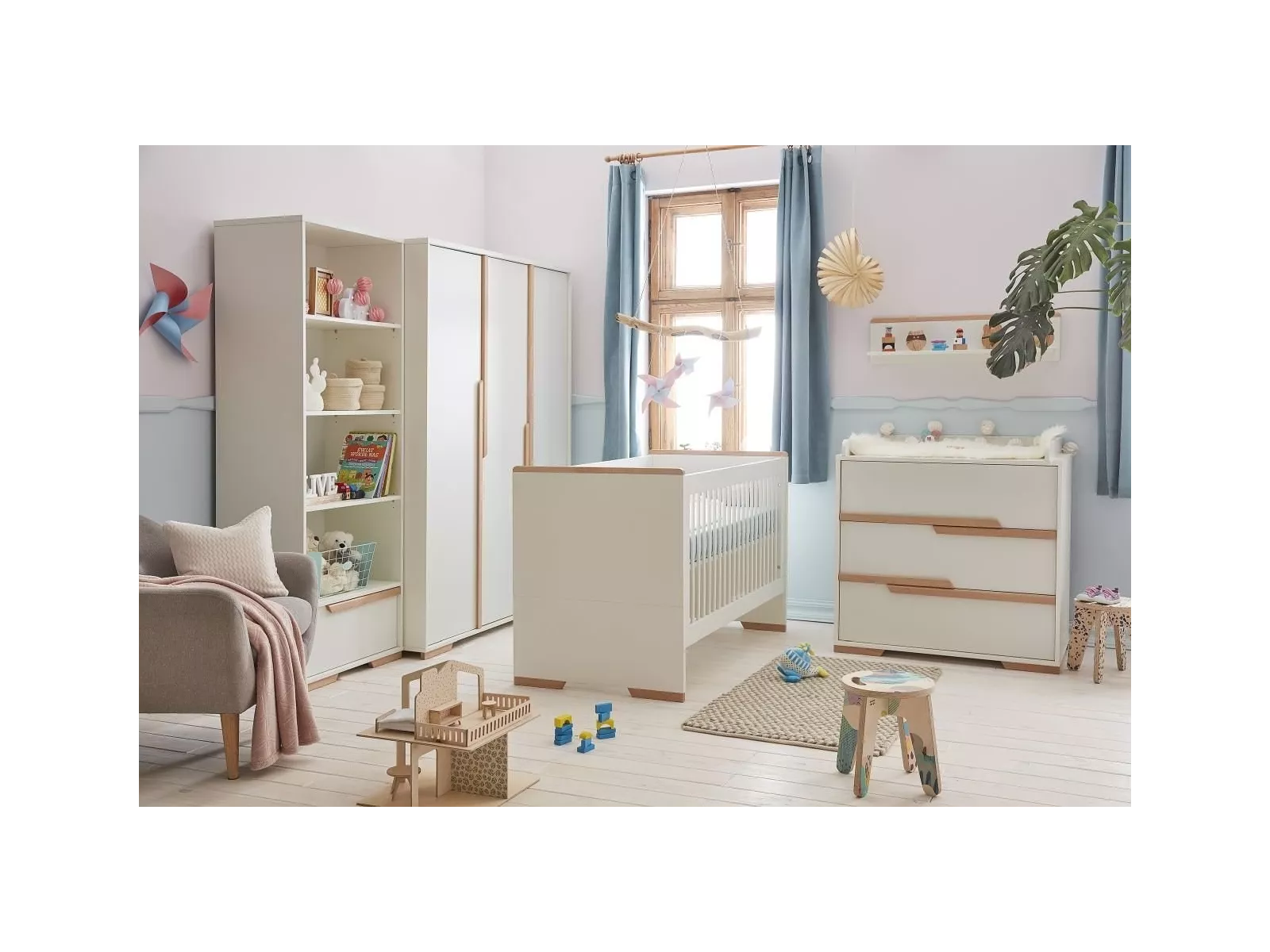 Material: lackierte MDF Platte (Fronten), Laminatplatte (Korpus + Innenelemente), Buchenholz (Applikationen - Griffe und Füße)